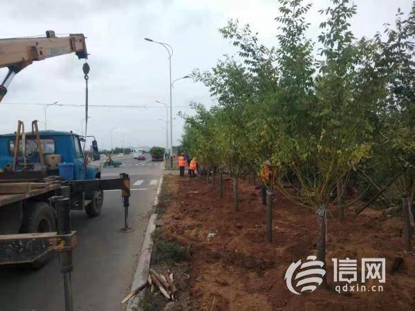 克日,在西海岸新区204国道城区以北段绿化工程现场,挖掘机挥舞长臂精准刨坑,大型吊车将苗木吊运至树坑内,工人们有的挥锹培土,有的牢靠苗木,施工现场一派忙碌情形。